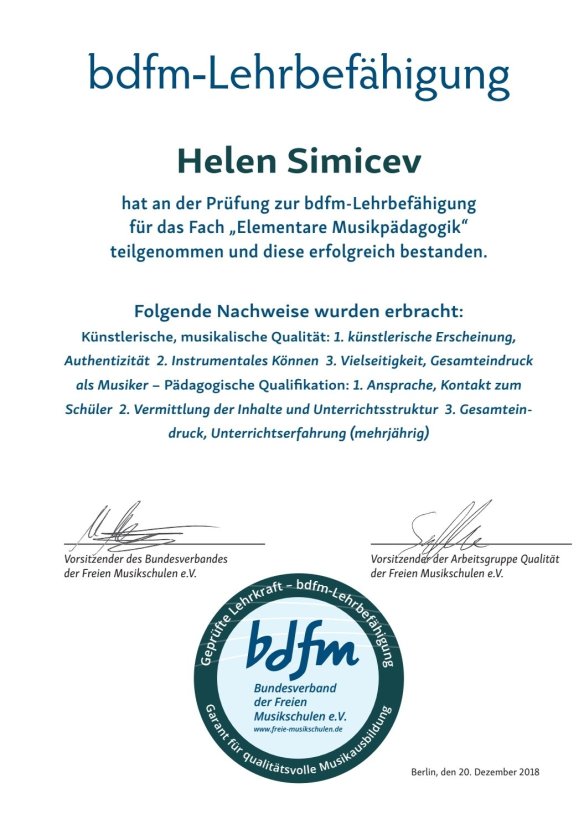 Seit September 2018 arbeite ich nur noch ausschließlich in der Maks Musikakademie in Großbottwar und habe dort die Fachbereichsleitung der Klangweltenkurse übernommen. Im Dezember 2018 habe ich die BdfM-Lehrbefähigung erhalten. Die Musikgarten-Lizenz habe ich aufgrunddessen abgegeben und bilde mich seitdem regelmäßig bei unterschiedlichen Dozenten fort.
